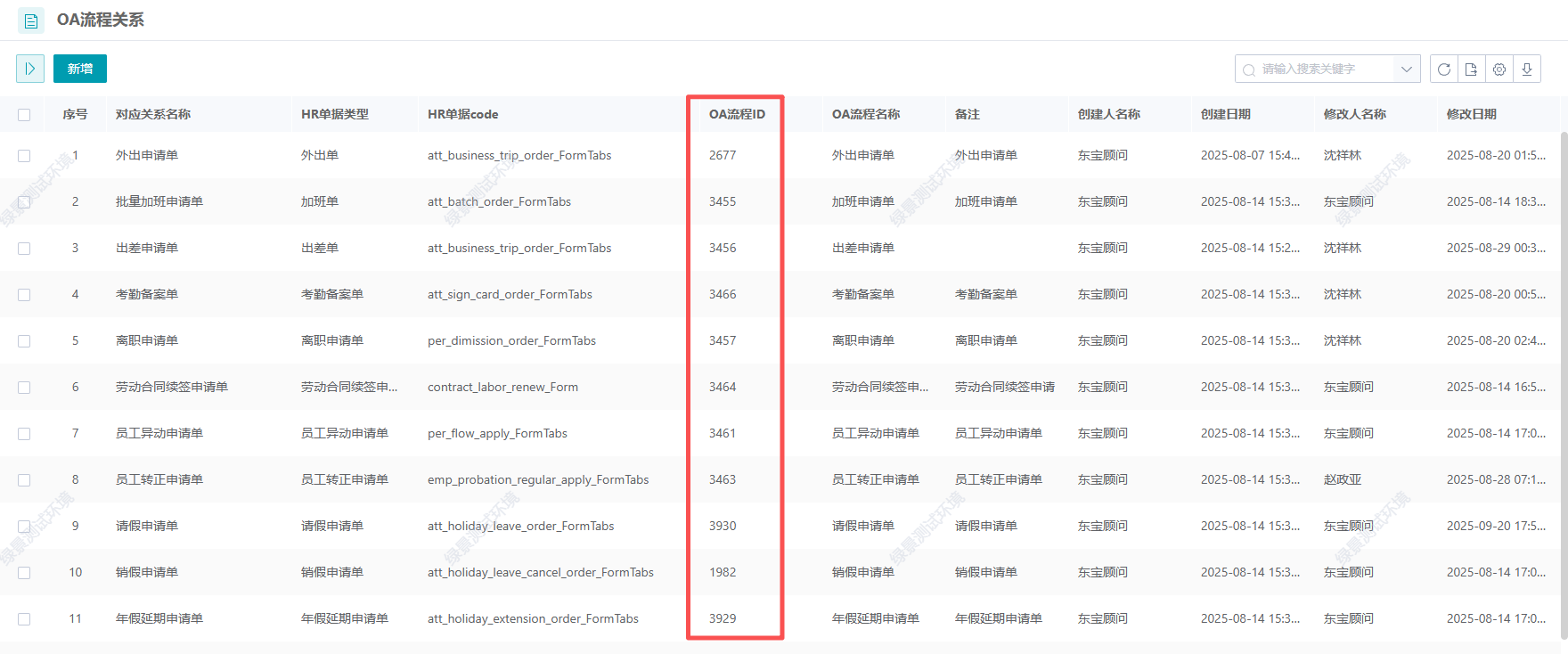 //OA用戶id:creatorId、OA流程id:workflowId、hr表名:tableCode